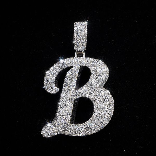This fully iced custom “B” pendant is crafted from solid 925 sterling silver and flooded with premium VVS moissanite stones for maximum brilliance and fire. The bold cursive design features a smooth, rounded silhouette completely covered in precision pavé-set stones, creating a flawless, high-end finish. The bail is fully iced to match, delivering consistent shine from top to bottom.