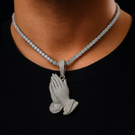 Show off true royalty energy with this bold Iced Out Praying Hands Pendant, crafted to perfection for those who want their jewelry to speak loud. Made from solid 925 sterling silver, this pendant is fully flooded with handset VVS-quality simulated diamonds, giving it a blinding shine from every angle. The detailed precision makes this piece stand out as a premium statement pendant.