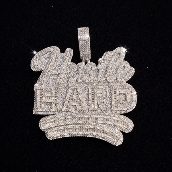 This fully iced custom “Hustle Hard” pendant is crafted from solid 925 sterling silver and completely flooded with premium VVS moissanite stones for maximum brilliance and fire. The layered design features “Hustle” in bold script above block-lettered “HARD,” creating a powerful stacked look with serious presence.