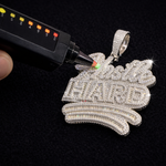 Every surface is precision pavé-set with tightly packed round stones, while the “HARD” lettering and bottom wave accents feature baguette-cut stones for added texture and dimension. The curved lower bars give the piece motion and depth, making it hit different from every angle. The fully iced bail is flooded to match, keeping the shine consistent from top to bottom.