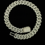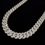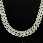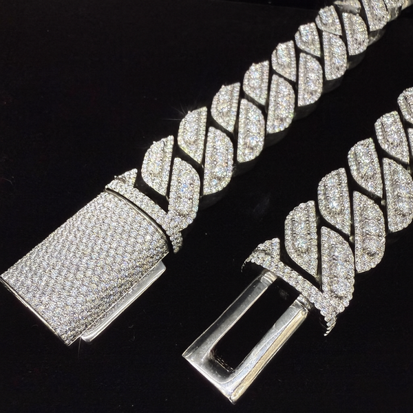 Elevate your style with the 18MM Prong-Style Cuban Link Chain, masterfully crafted in 925 sterling silver and handset with VVS, D-color Moissanites, the highest standard of clarity and brilliance in fine jewelry.