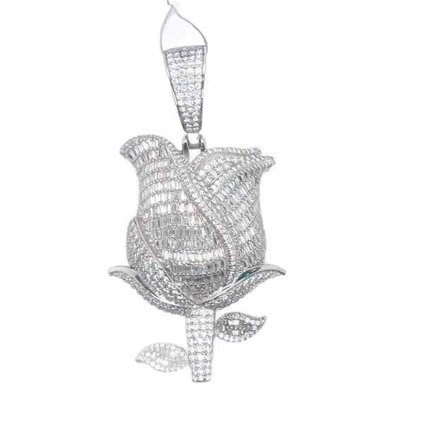 925 Sterling Silver Rose Flower Baguette VVS CZ Iced Out Pendant.  Crafted from real Solid .925 Sterling Silver with an incredible bling bling shine.  Limited Edition Iced Out Hip Hop...