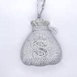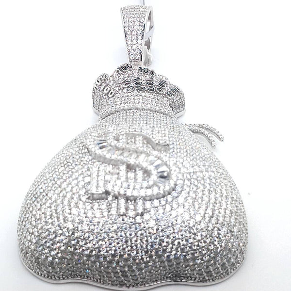 ey Bag VVS Moissanite Pendant .925 Sterling Silver. This iced out Moissanite Pendant is simply breathtaking and displays an incredible bling bling shine. We insisted on using the finest Moissanite stones available to craft this perfect high end 'diamond' bling bling Moissanite Micro Pave Charm. Moissanite stones are carbon based stones just like real Diamonds. The benefit of our Moissanite hip hop jewelry is that you get a better shine for much less money than genuine Diamonds. Our Moissanite Stones have a higher refractive index than real Diamonds and rank 9-9.5 on Mohs hardness scale.